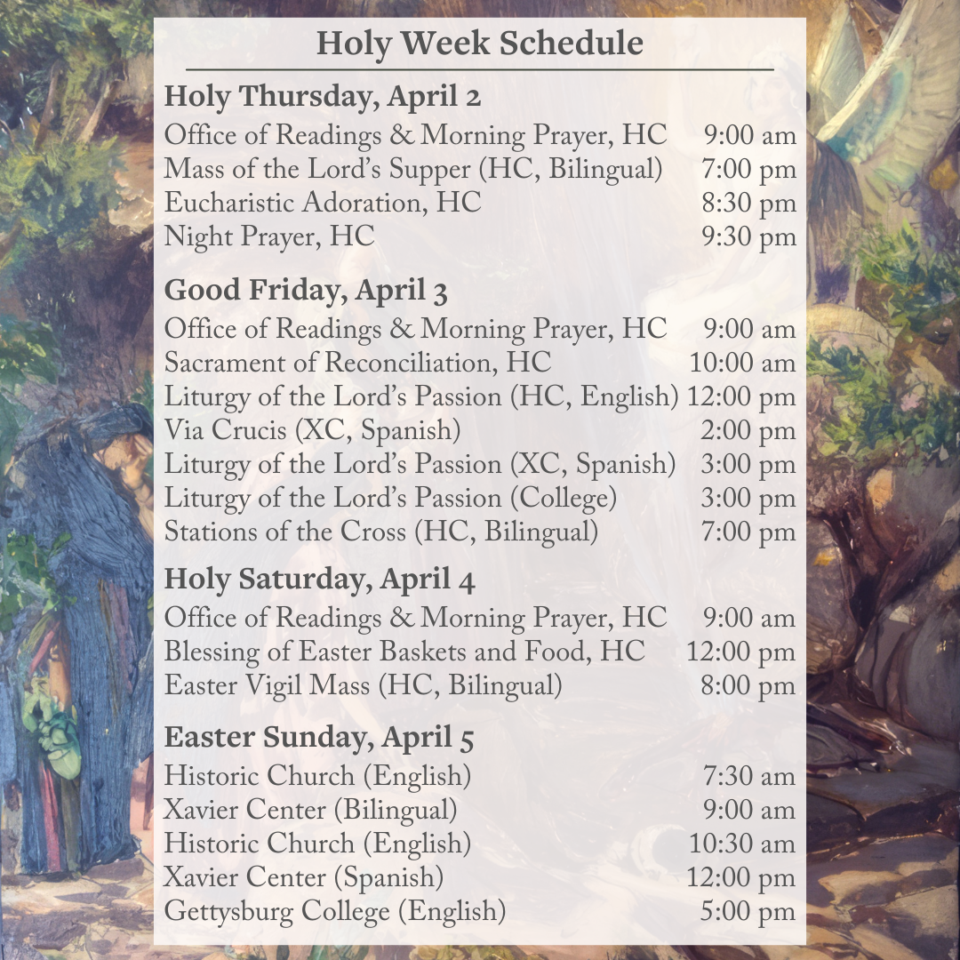 Saint Francis Xavier Roman Catholic Parish, which offered refuge to the injured at the Battle of Gettysburg, continues to offer a place of healing and hope by proclaiming the Word through worship, Sacraments and service to all in need. Locations, Mass and Confession times are below the Lenten section.