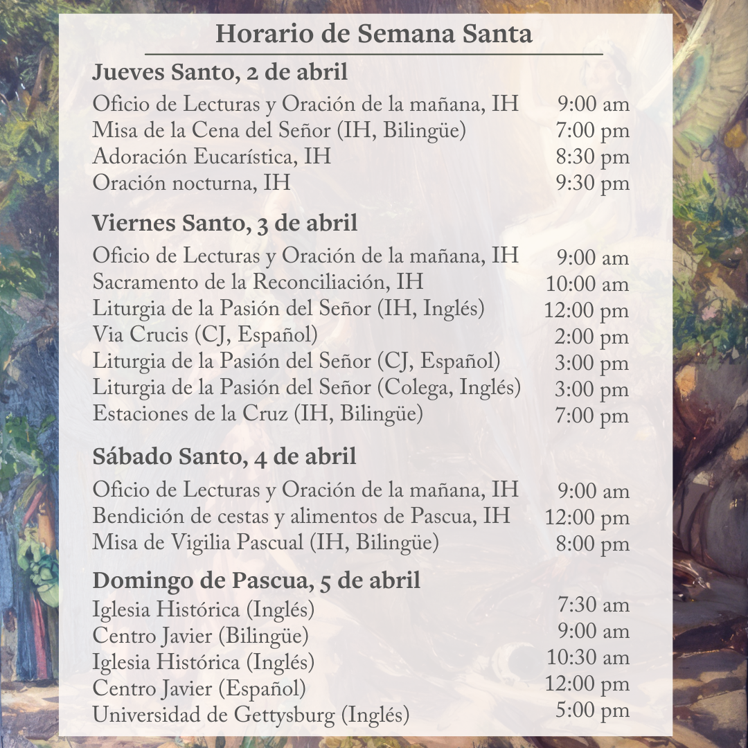 Saint Francis Xavier Roman Catholic Parish, which offered refuge to the injured at the Battle of Gettysburg, continues to offer a place of healing and hope by proclaiming the Word through worship, Sacraments and service to all in need. Locations, Mass and Confession times are listed below the Holy Week schedules.